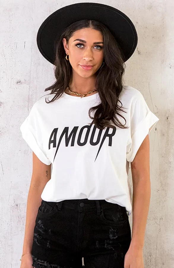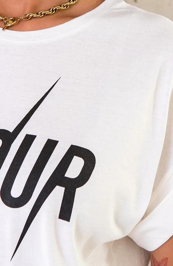 Product: Deze top is perfect om te combineren met jouw favoriete items! De oversized top is voorzien van zwarte tekst op de voorkant.