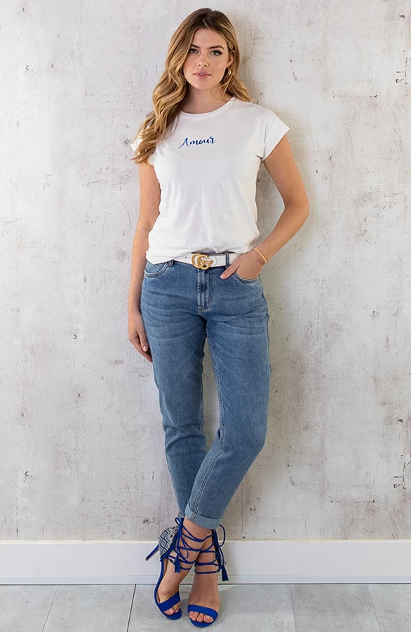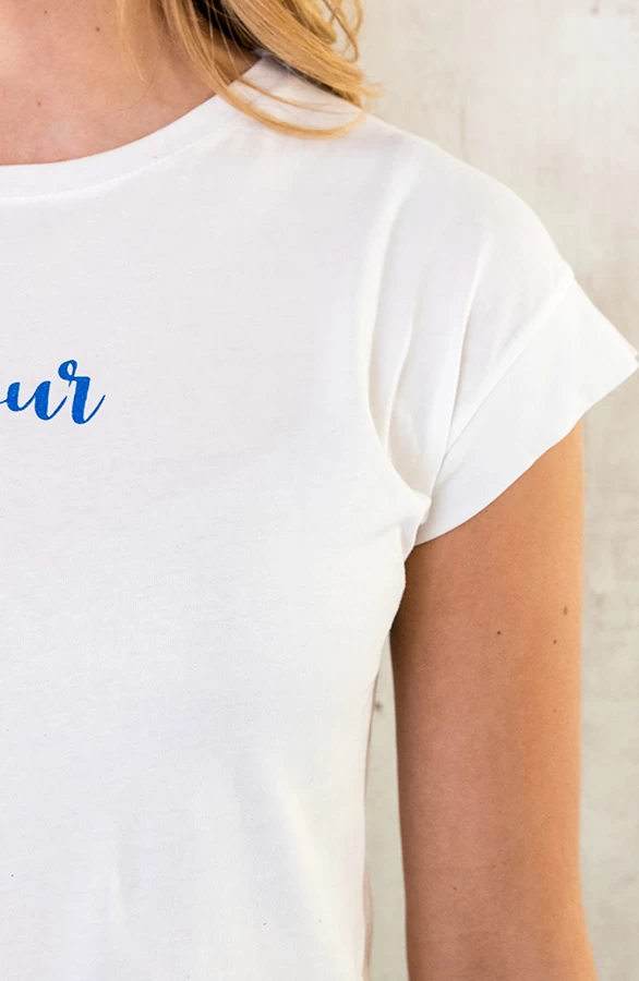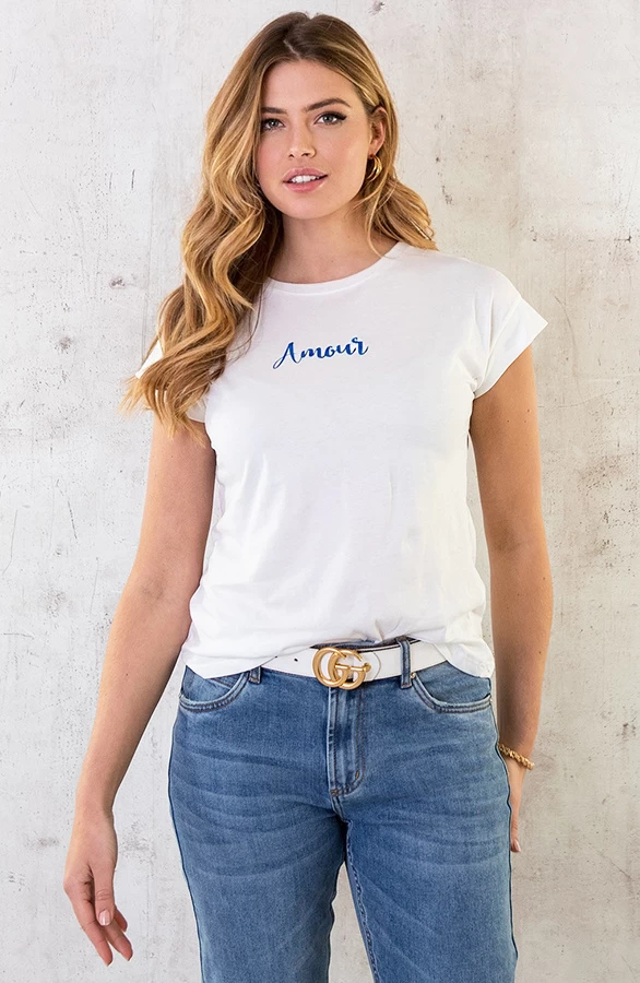 Details: ronde hals, korte mouwen, tekst op de voorkant en glitters Materiaal: 100% Katoen