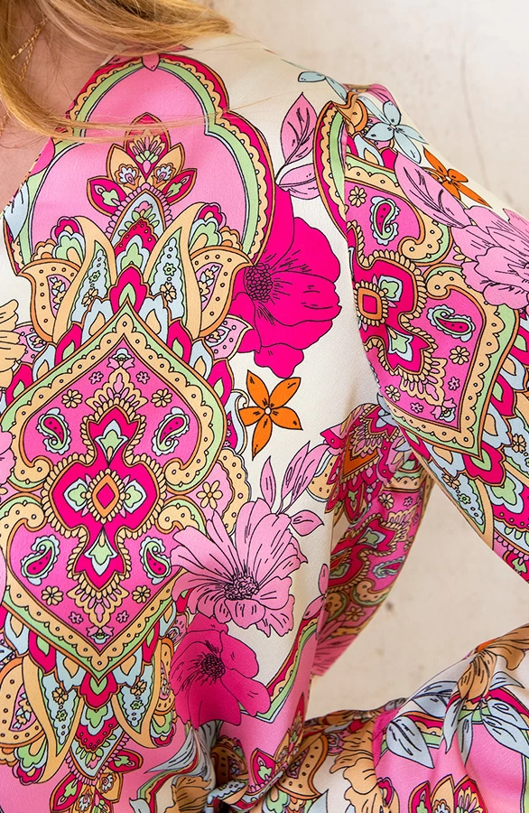 Details: v-hals, knoopsluiting en flared mouwen Materialen: 5% Elastaan, 95% Polyester
