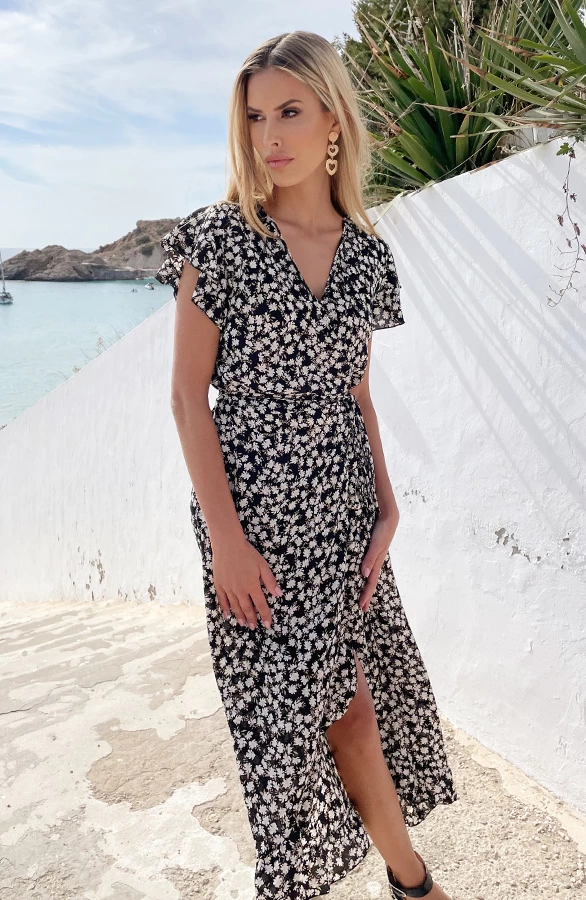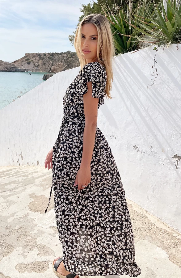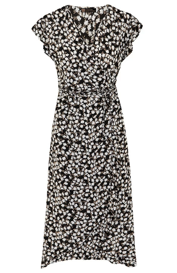 Product: Deze fijne jurk met bloemenprint is een múst voor jouw garderobe! De jurk is voorzien van een overslag en een lint om te strikken.