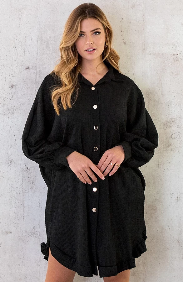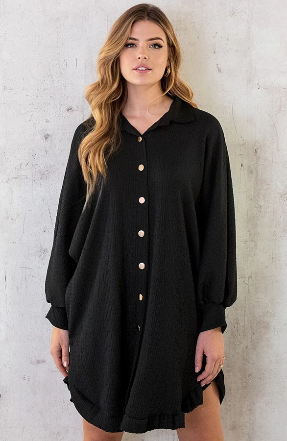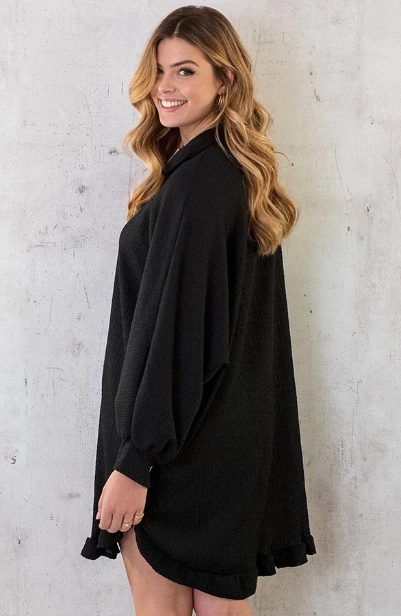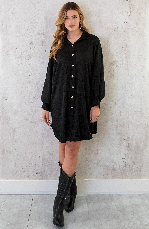 Product: Hoe leuk is dit zwarte jurkje met smocked effect?! De blouse dress is voorzien van gouden knoopjes en ruches aan de onderkant.