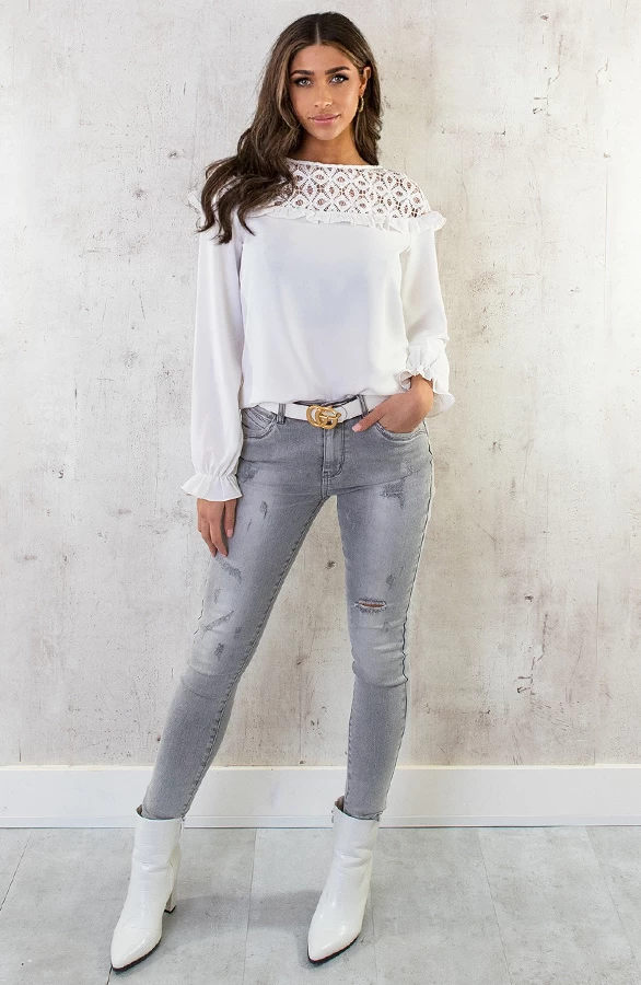 Product: So pretty! Deze witte blouse is voorzien van prachtige details! De blouse is voorzien van elastiek bij de mouwen en kant en ruches aan de bovenkant.