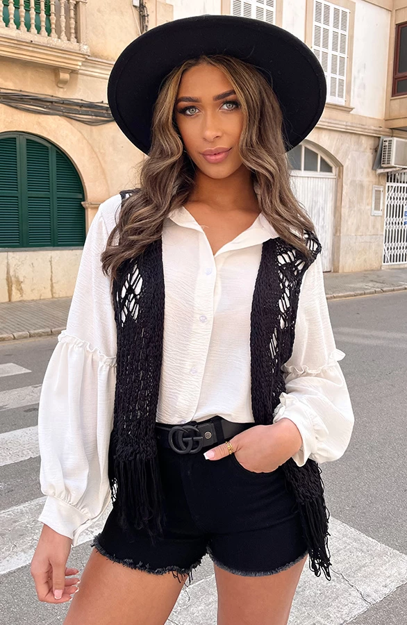 Product: Een witte blouse is altijd een goed idee! De blouse is voorzien van ballonmouwen met ruches en een knoopsluiting.