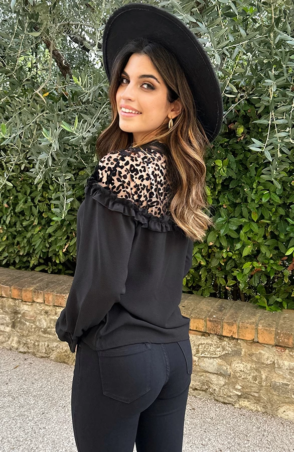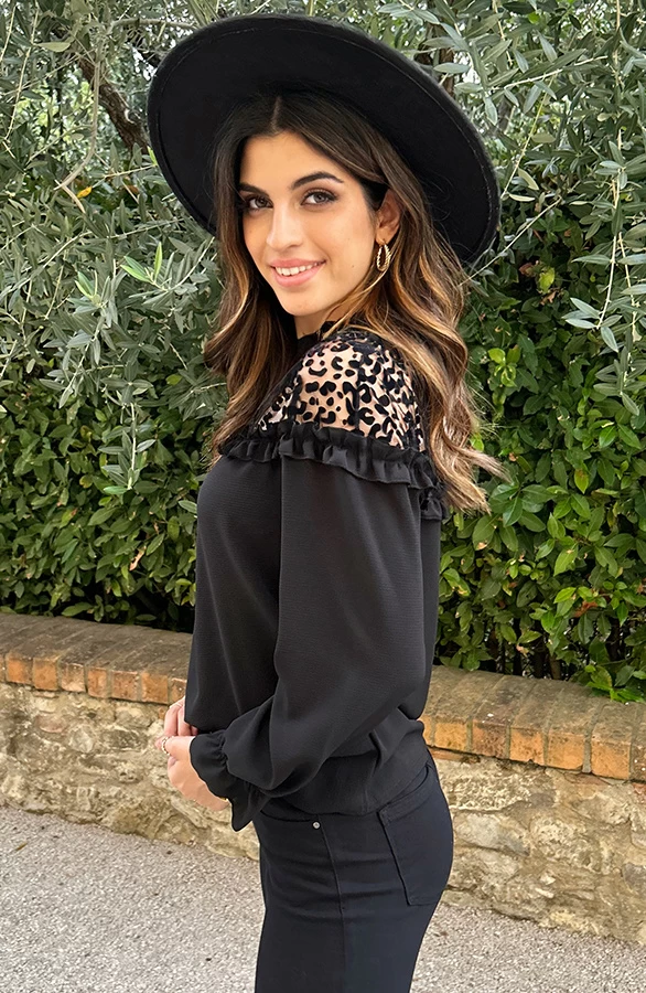 Product: Hoe mooi is deze blouse met panterprint?! Wij zijn verliefd! De blouse is voorzien van een panterprint en ruches.