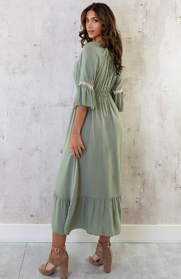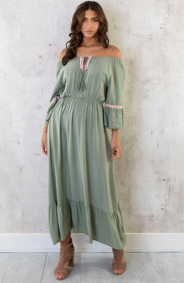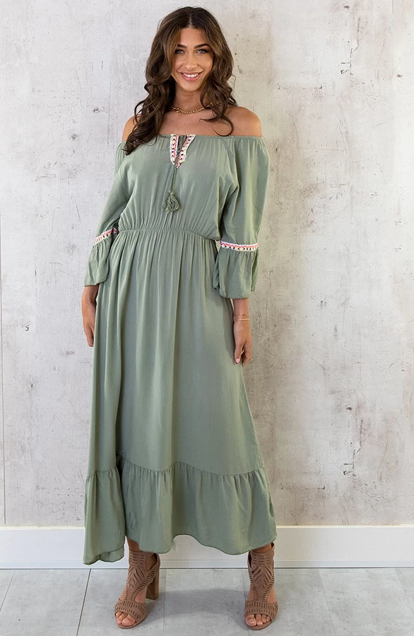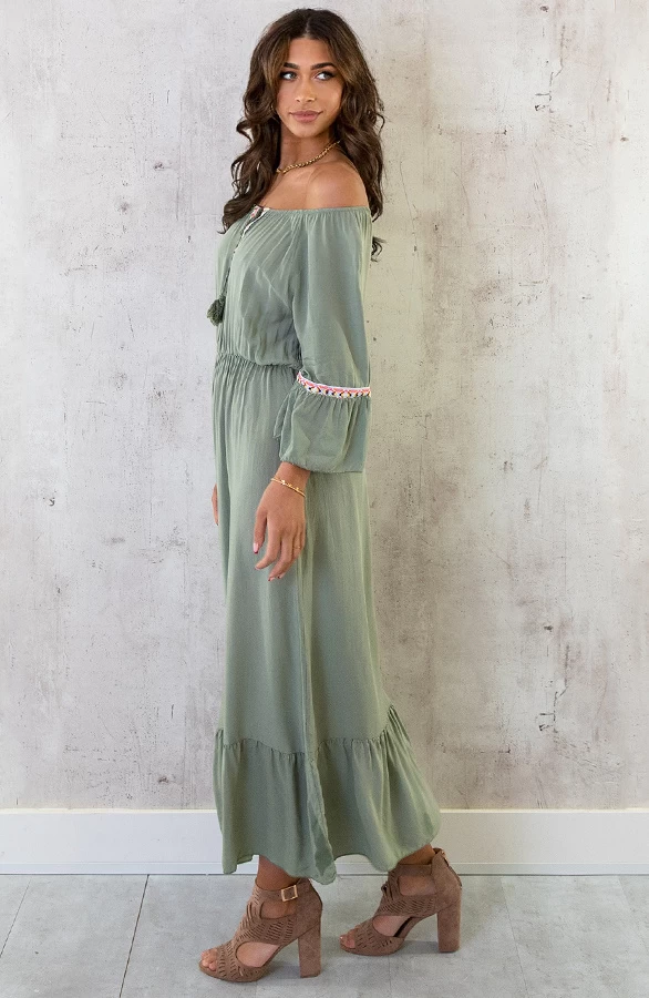 Product: Hoe tof is deze legergroene jurk?! De offshoulder jurk is voorzien van flared mouwen en elastiek in de taille. Shop jouw favoriete kleur!