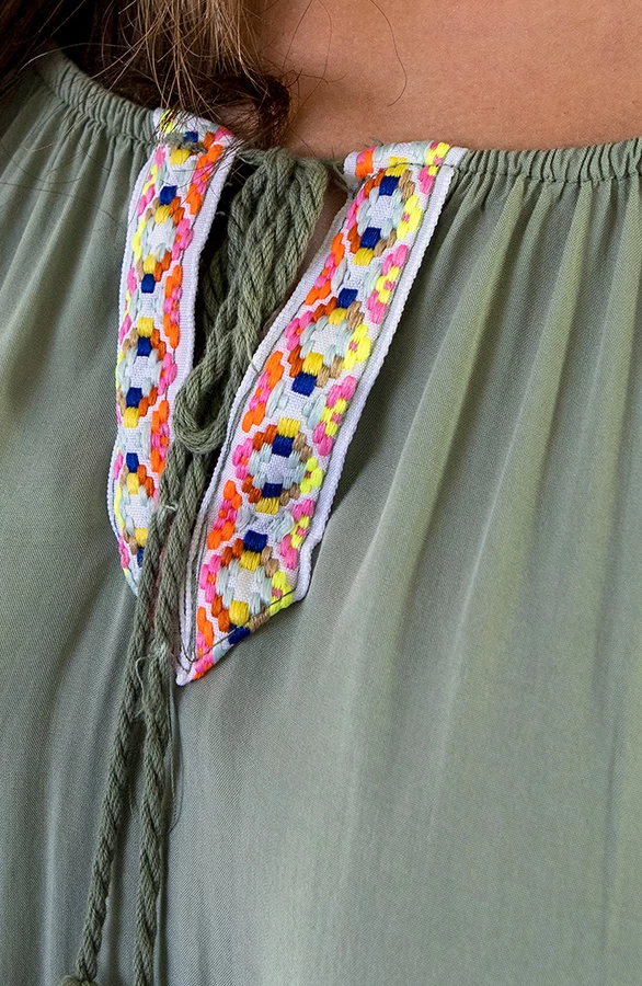 Details: offshoulder, elastiek in de taille, flared mouwen, strik bij de hals en driekwart mouwen Materiaal: 100% Viscose