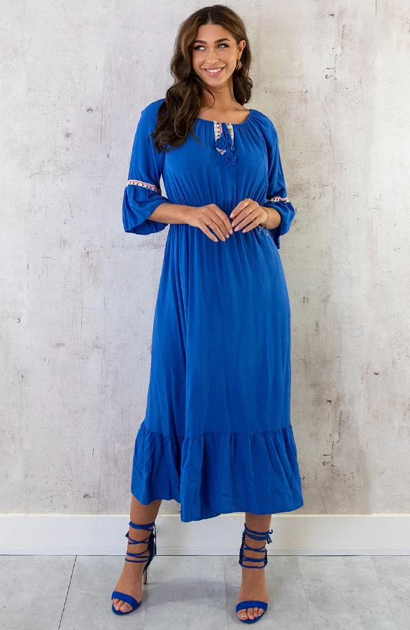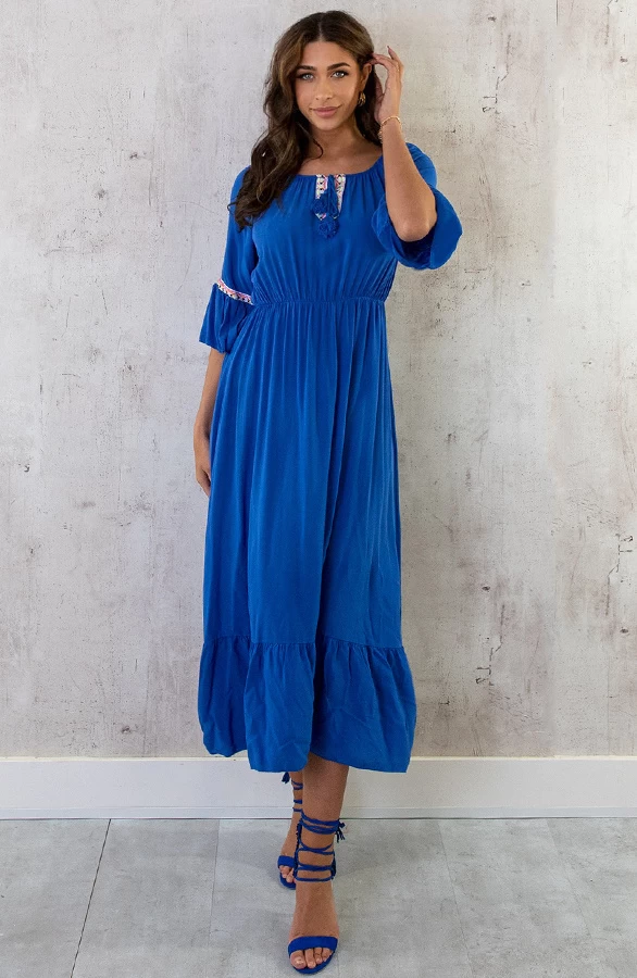 Product: Deze jurk is perfect voor het aankomende seizoen! De maxijurk is voorzien van driekwart mouwen en elastiek in de taille.