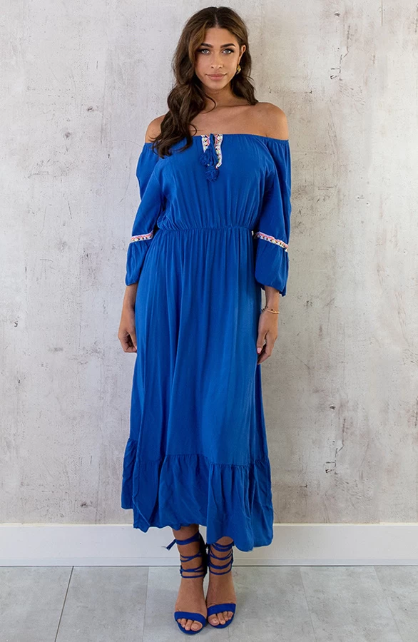 Details: offshoulder, elastiek in de taille, flared mouwen, strik bij de hals en driekwart mouwen Materiaal: 100% Viscose