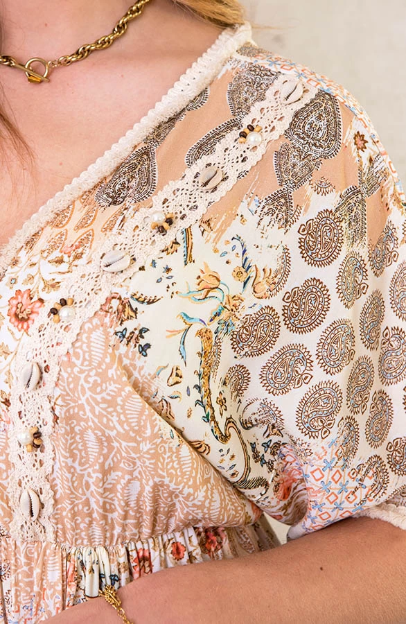 Details: korte mouwen, elastiek in de taille, v-hals aan voor- en achterkant en gevlochten touwtjes Materiaal: 100% Viscose