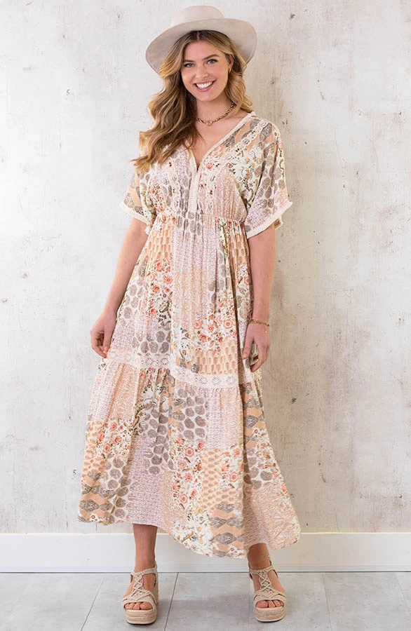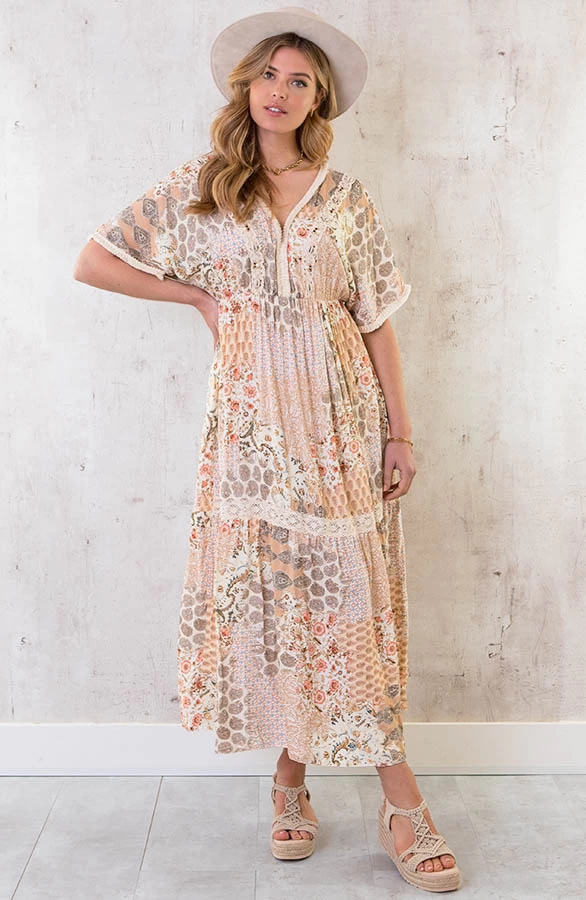 Product: Van deze jurk krijg je gelijk een vakantie gevoel! We LOVE it! De jurk is voorzien van een v-hals en elastiek in de taille.