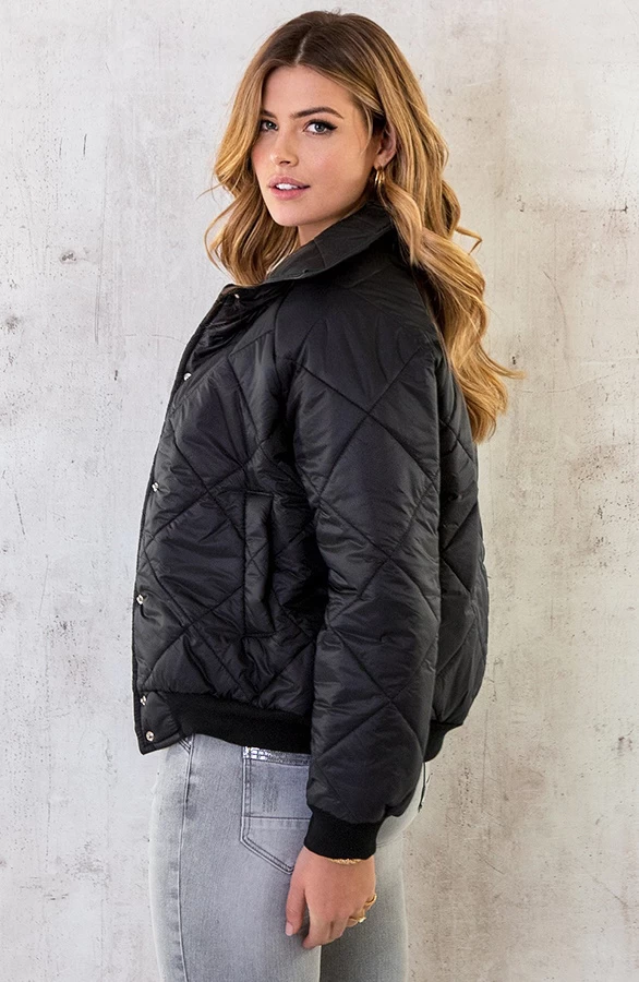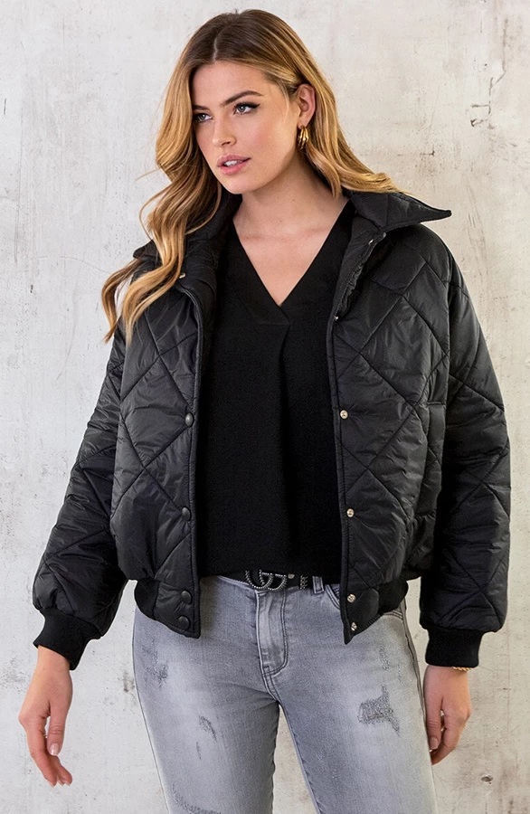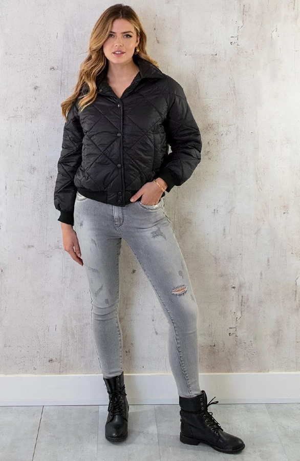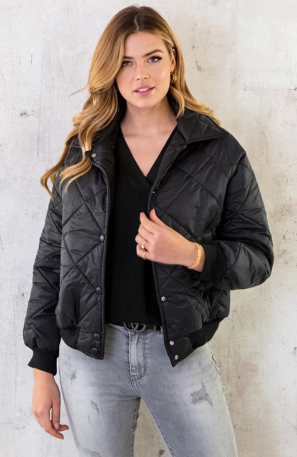 Product: Deze zwarte bomber is een aanwinst voor jouw garderobe! Het bomberjack is voorzien van en ruitpatroon en steekzakken.