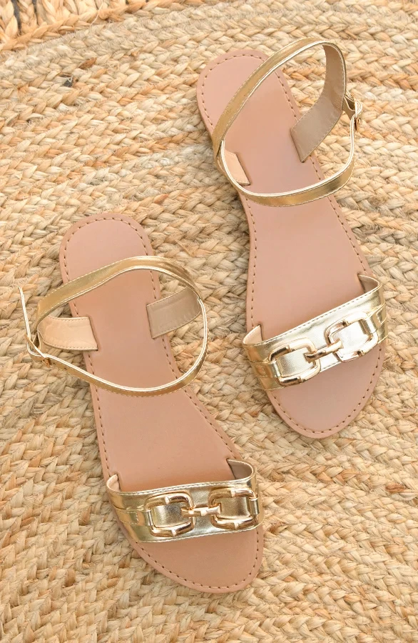 Product: Deze sandalen zijn dé eyecatchers van jouw outfit! De gouden sandalen zijn voorzien van een gespsluiting en een gouden detail.