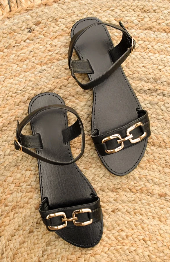 Product: Deze zwarte sandalen met goud detail zijn perfect om te combineren met jouw favoriete items! De sandalen zijn voorzien van een gespsluiting en verkrijgbaar in meerdere kleuren!