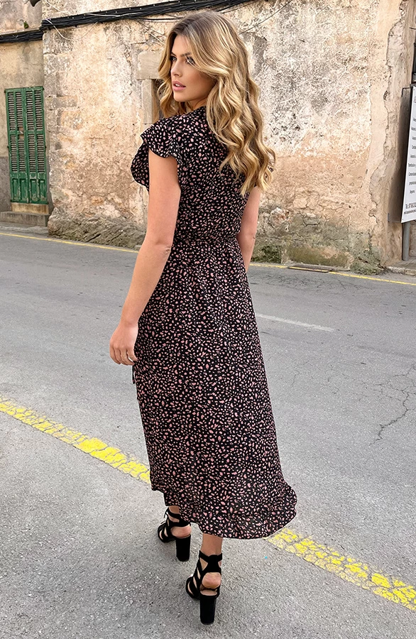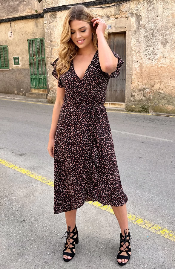 Product: Nu in nóg een variant te shoppen, deze té leuke midi jurk met cheetahprint! Daarnaast is deze midi jurk voorzien van een overslag met ruches en een bijpassend lint om te strikken!