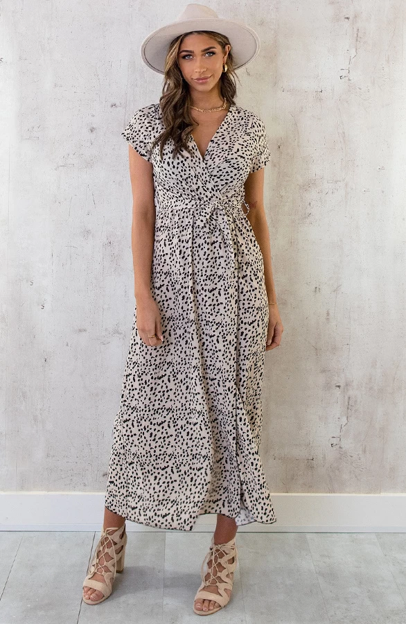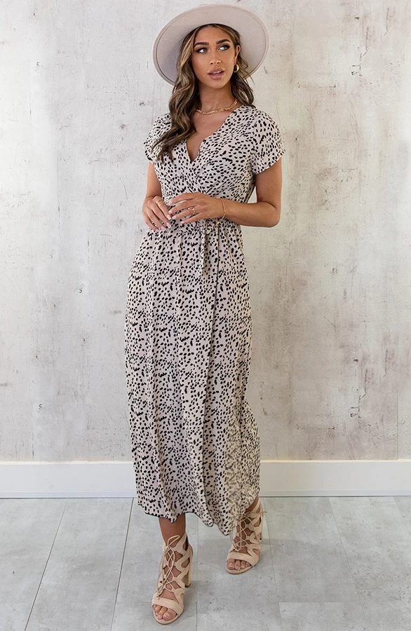 Product: Met deze midi jurk met cheetah print ben jij helemaal on-trend! Draag deze lange jurk met dierenprint met stoere boots! De kleur van de jurk is niet wit, maar beige van kleur.