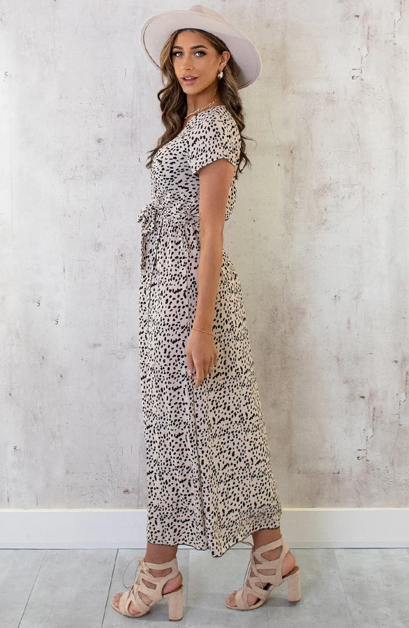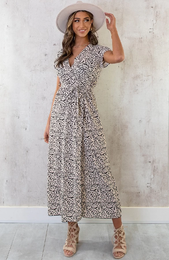 Product: Met deze midi jurk met cheetah print ben jij helemaal on-trend! Draag deze lange jurk met dierenprint met stoere boots! De kleur van de jurk is niet wit, maar beige …