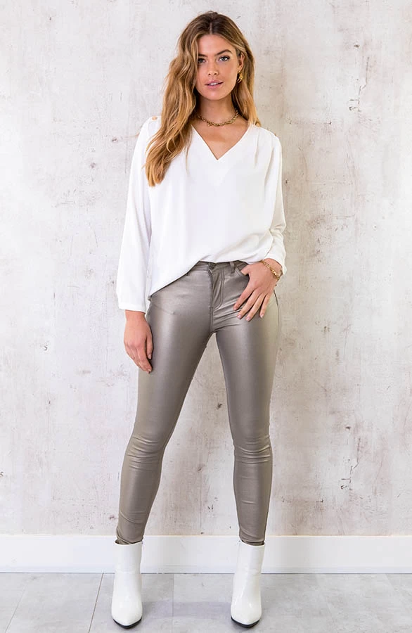 Product: Met deze coating jeans loop jij er super fashionable bij! De skinny jeans is voorzien van een knoop-ritssluiting, 5 zakken en riemlussen.