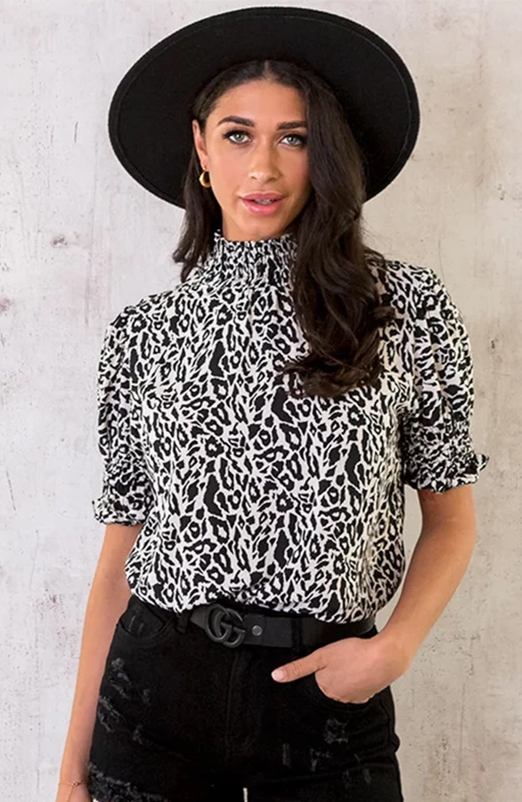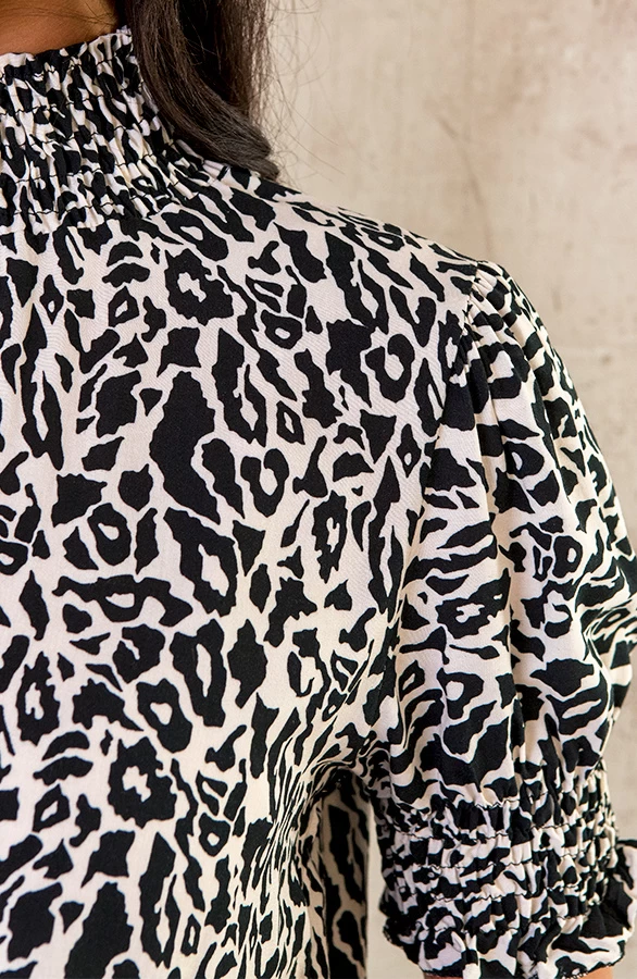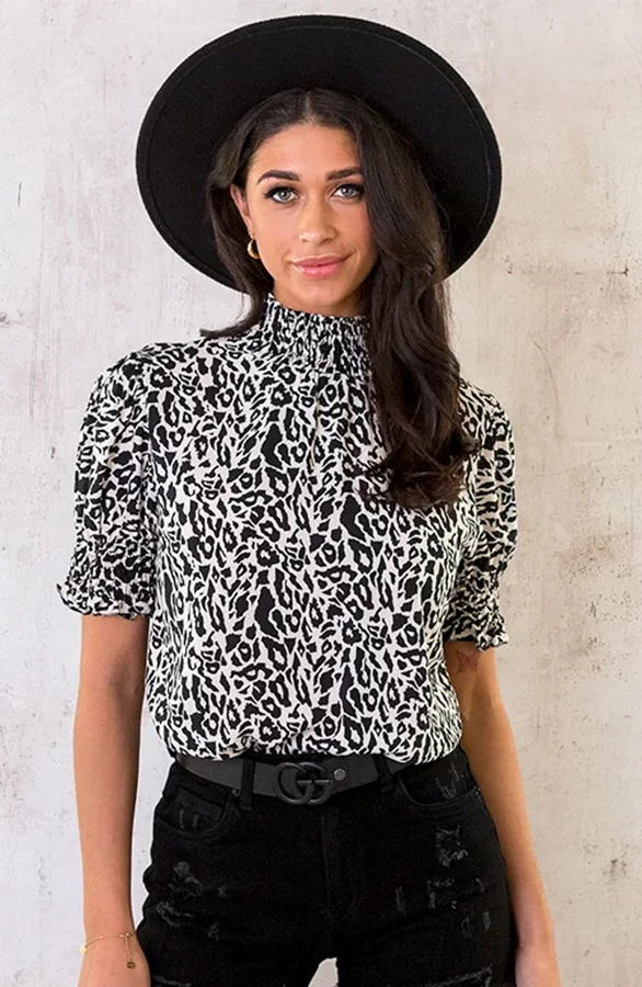 Product: Deze gave top is een aanwinst voor jouw garderobe! De col top met elastiek bij de mouwen en bij de colkraag is voorzien van een trendy dierenprint.