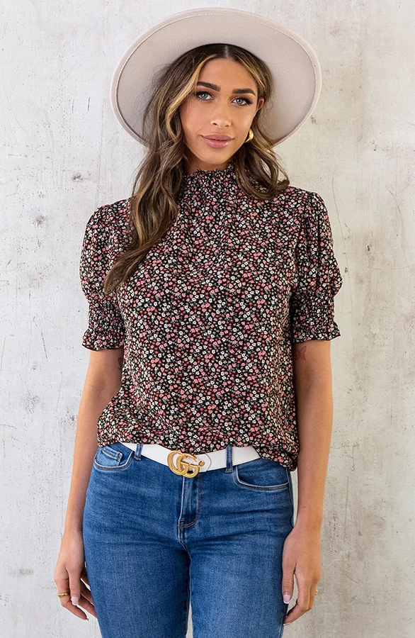 Product: Deze col top is onmisbaar in jouw garderobe! De top is voorzien van een bloemenprint en elastiek bij de mouwen en bij de colkraag.