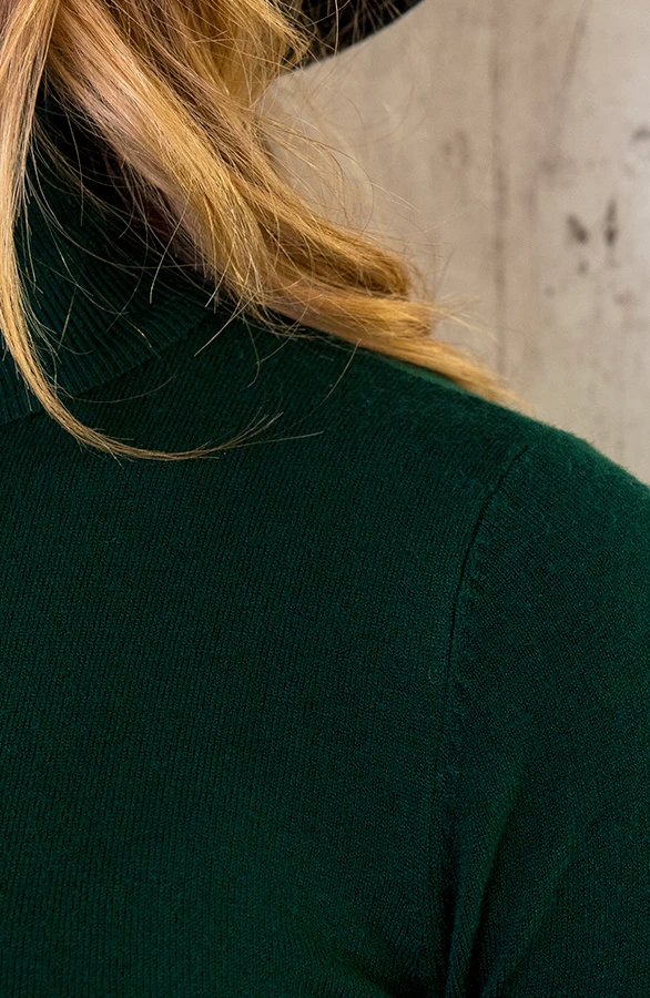 Product: Deze coltrui in smaragdgroen is een must voor jouw garderobe! De trui is voorzien van een dubbelgeslagen col en bevat veel stretch.
