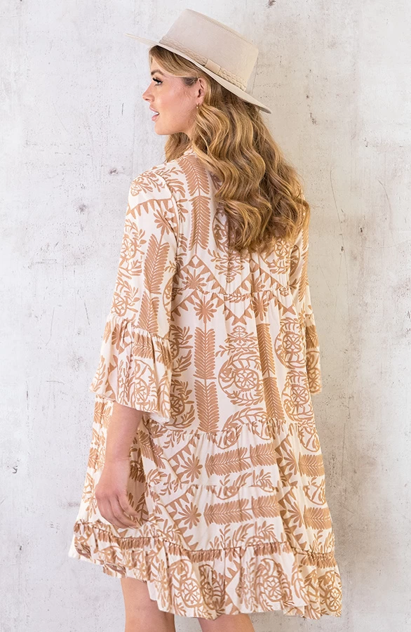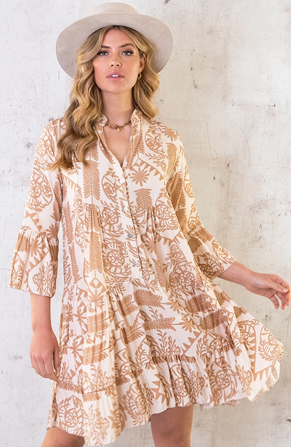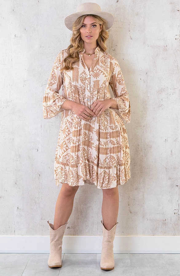 Product: The perfect dress! Wij krijgen helemaal summer feelings van deze te leuke tuniek! De beige tuniek valt oversized en is voorzien van een v-hals en lange mouwen.