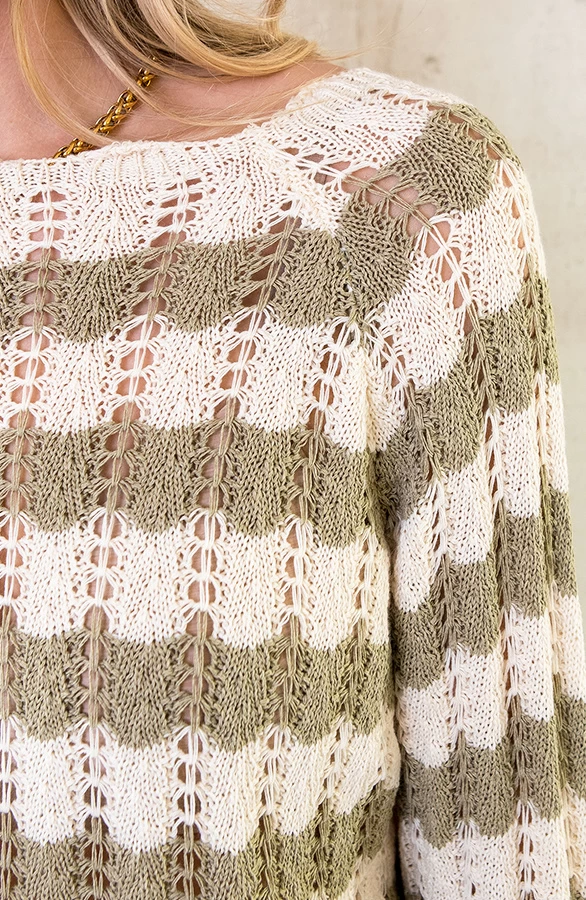 Details: ronde hals, gestreept patroon, gehaakte stof en flared mouwen Materiaal: 100% Katoen