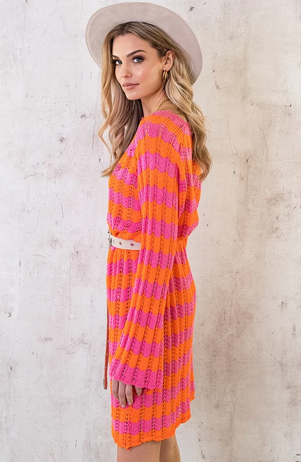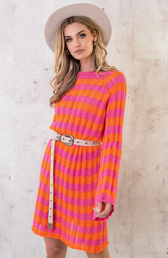 Product: Eyecatcher! Hoe gaaf is deze roze oranje gehaakte jurk?! Een echte múst voor op vakantie!