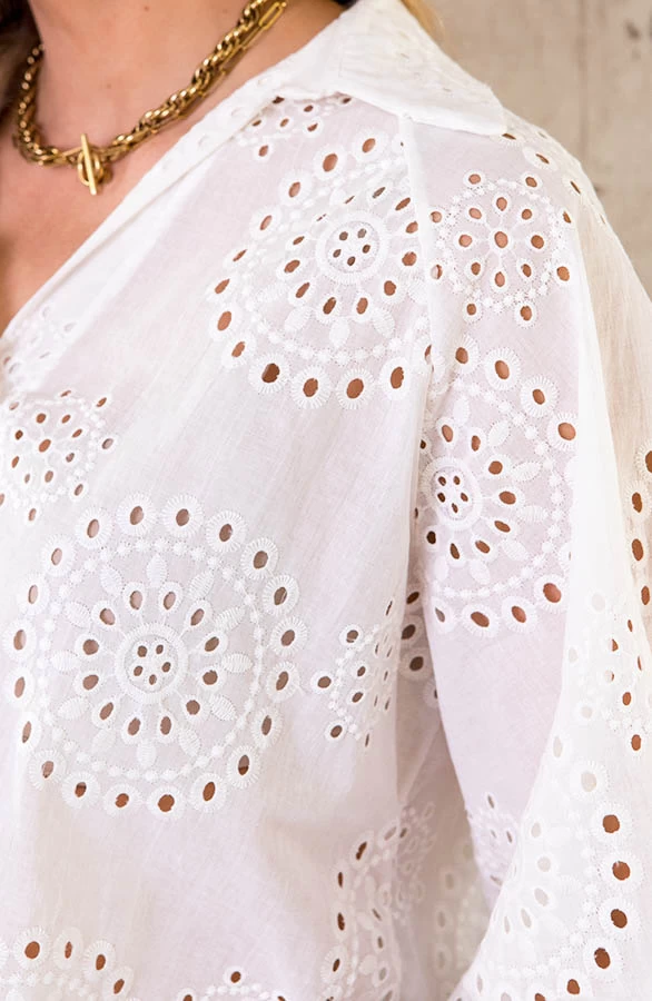 Details: v-hals, lange mouwen, doorschijnende stof, knoopje bij de mouwen, broderie en ballonmouwen Materiaal: 100% Katoen