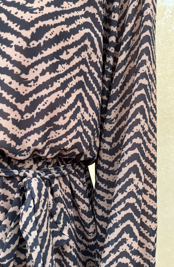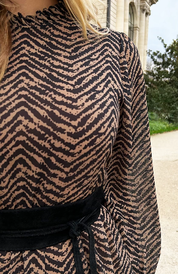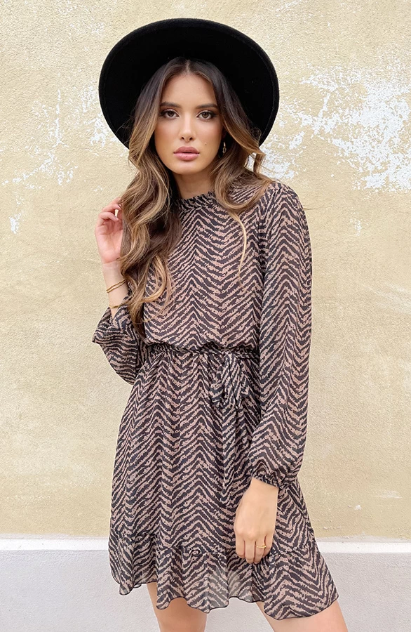 Product: Heb jij al een camel jurkje in de kast hangen?! Dit jurkje mag je niet missen! De jurk is voorzien van een super leuke print en bijpassend ceintuur.