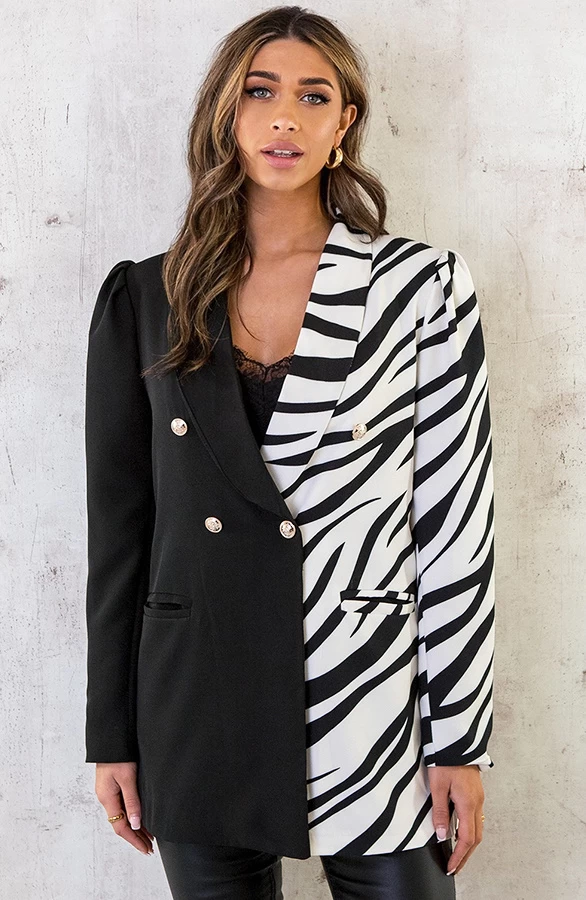 Product: WOW! Steel de show met deze eyecatcher! De zwart witte blazer met zebraprint is voorzien van bewerkte knopen, zakken en pofmouwen.