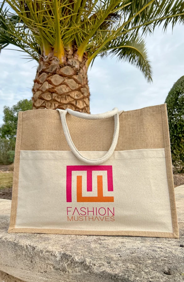 Details: print op de voorkant, kort hengsel, groot binnenvak en voorvak Materialen: 20% Katoen, 80% Jute