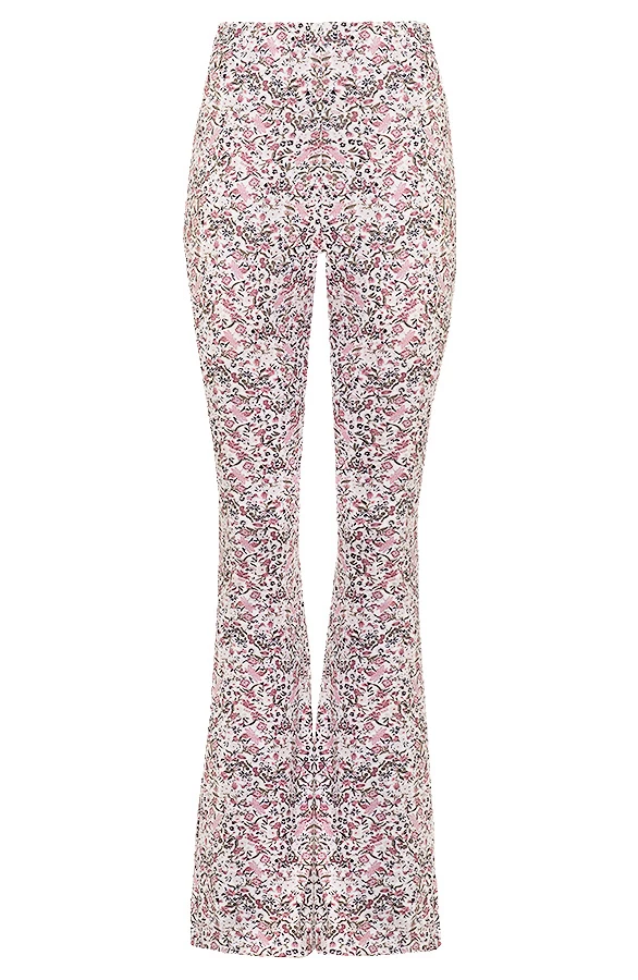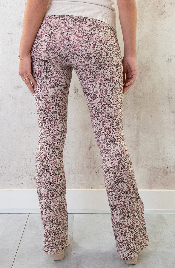 Details: elastieken band, stretch, bloemenprint en flared pijpen Materialen: 5% Spandex, 95% Polyester