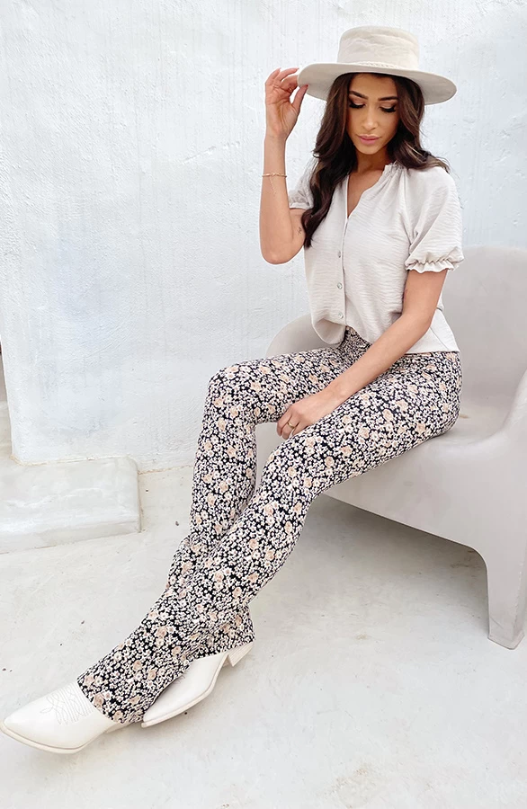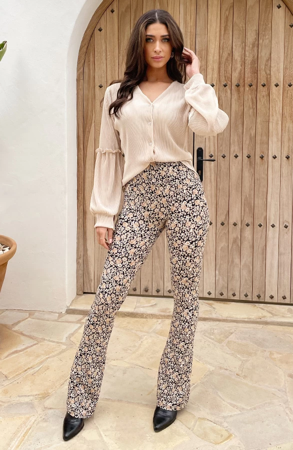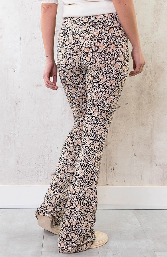 Details: elastieken band, stretch, bloemenprint en flared pijpen Materialen: 95% Polyester, 5% Spandex