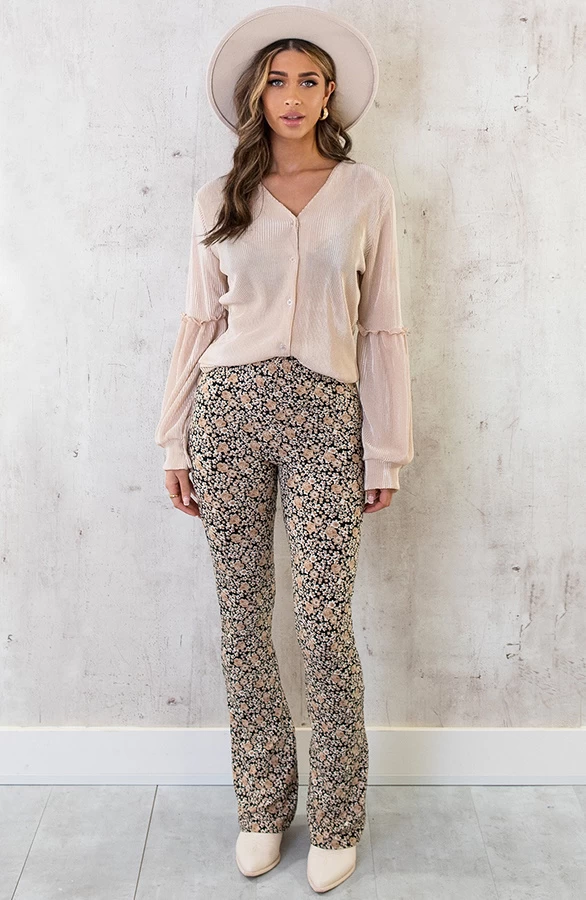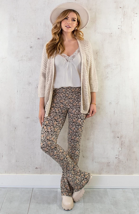 Product: Yes de collectie flared broeken is weer uitgebreid met deze té gekke broek! De flared broek is voorzien van een all=over bloemenprint, elastieken band en lekker veel stretch.