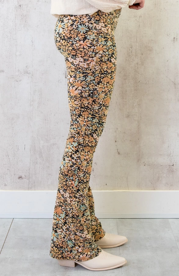 Details: elastieken band, bloemenprint en flared pijpen Materialen: 95% Polyester, 5% Spandex