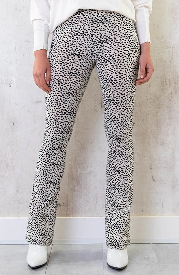 Details: elastieken band, stretch, cheetahprint en flared pijpen Materialen: 95% Polyester, 5% Spandex