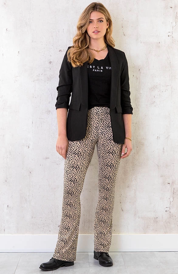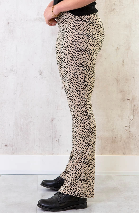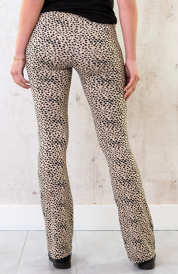 Details: elastieken band, stretch, cheetahprint en flared pijpen Materialen: 95% Polyester, 5% Spandex