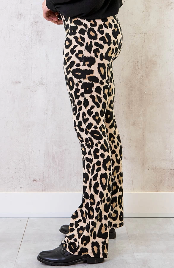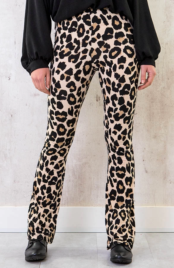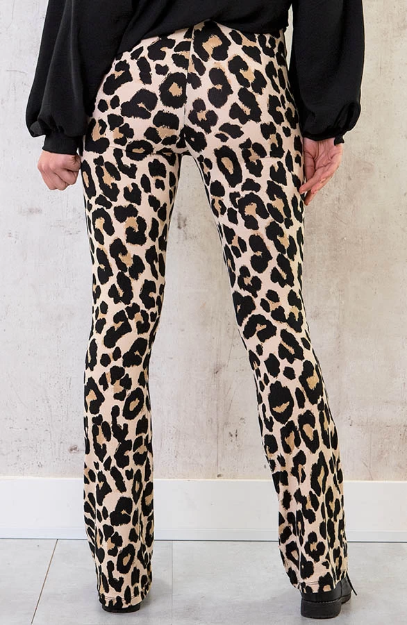 Details: elastieken band, stretch, panterprint en flared pijpen Materialen: 5% Spandex, 95% Polyester