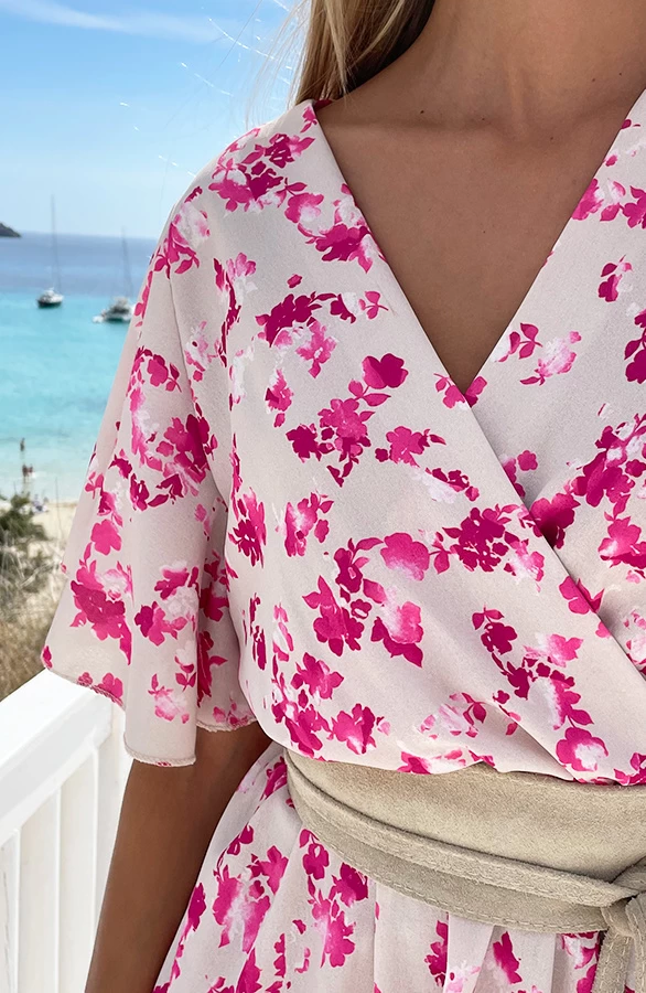 Details: v-hals, vleermuismouwen, bloemenprint, bijpassend ceintuur in de taille en elastiek in de taille Materiaal: 100% Polyester