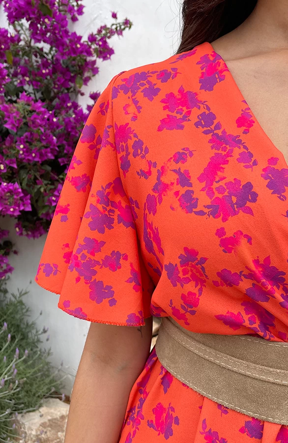 Product: Eyecatcher! Dit té gekke oranje jurkje met paarse bloemenprint wil je toch hebben?! Het jurkje is voorzien van de perfecte pasvorm en heeft elastiek in de taille.