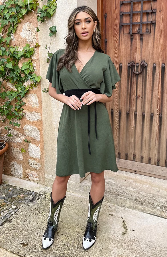 Product: Deze jurk is perfect voor het aankomende seizoen! De jurk met vleermuismouwen is voorzien van een v-hals en bijpassend ceintuur in de taille.