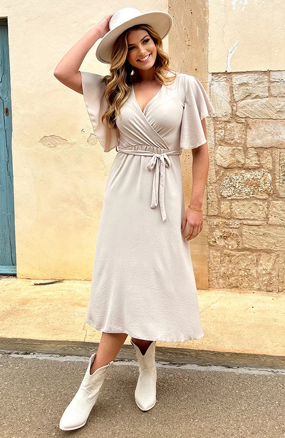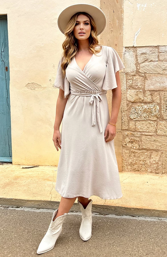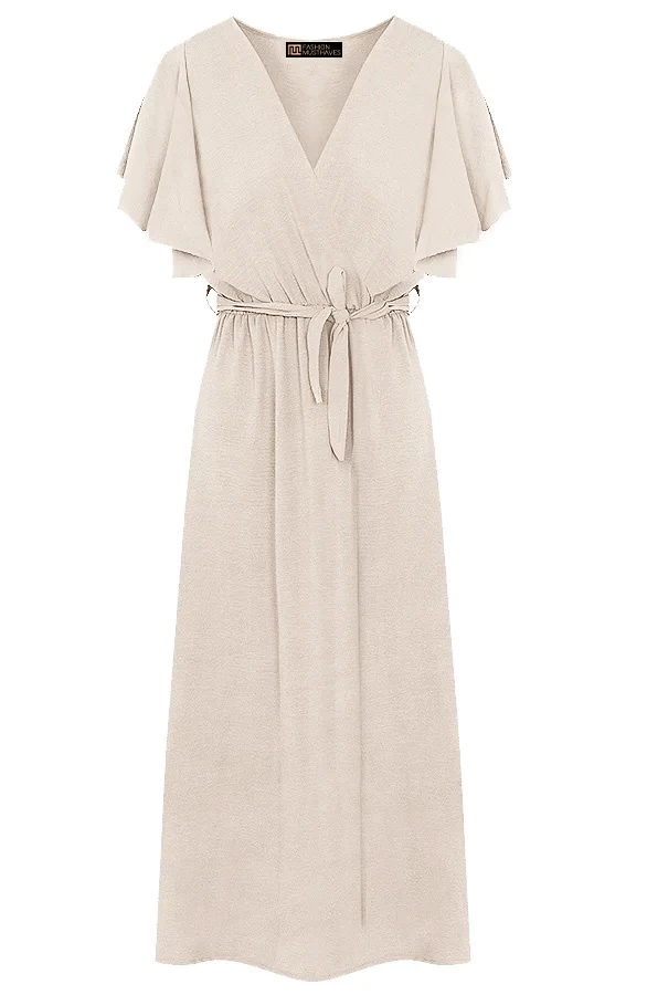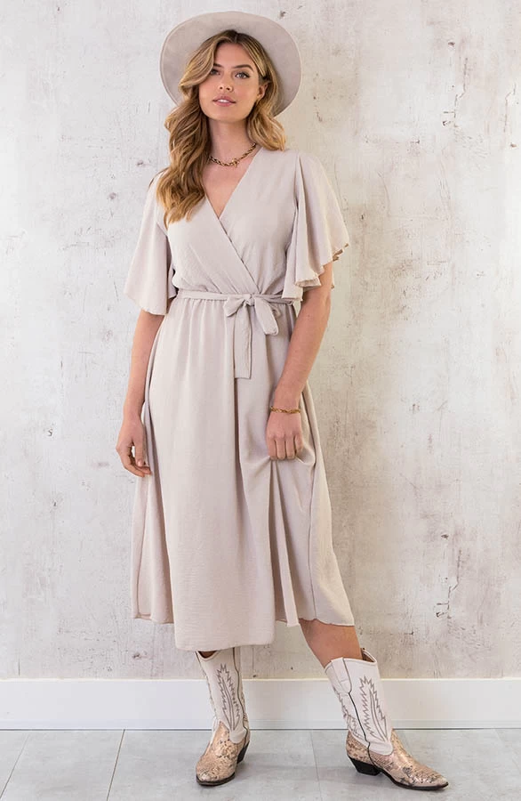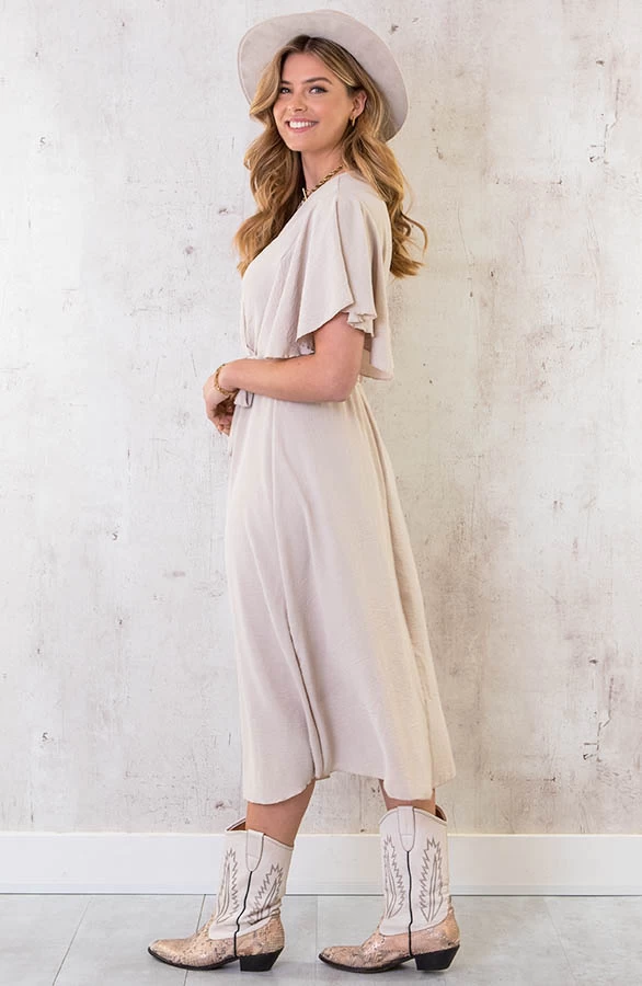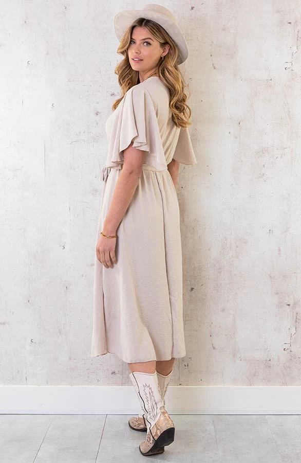 Product: We LOVE beige! Deze midi jurk mag niet ontbreken in jouw garderobe! De jurk is voorzien van elastiek in de taille en een bijpassend lint om te strikken!