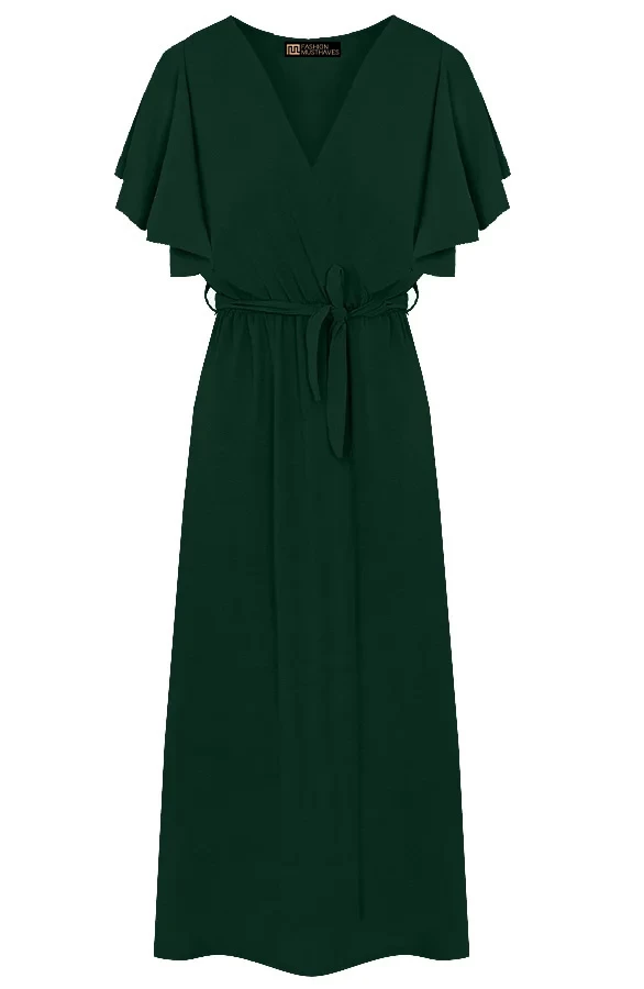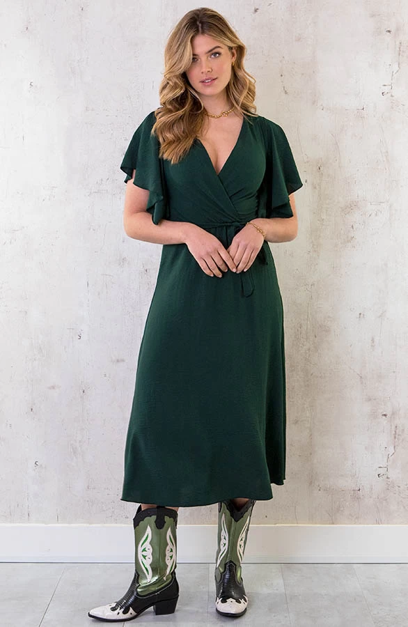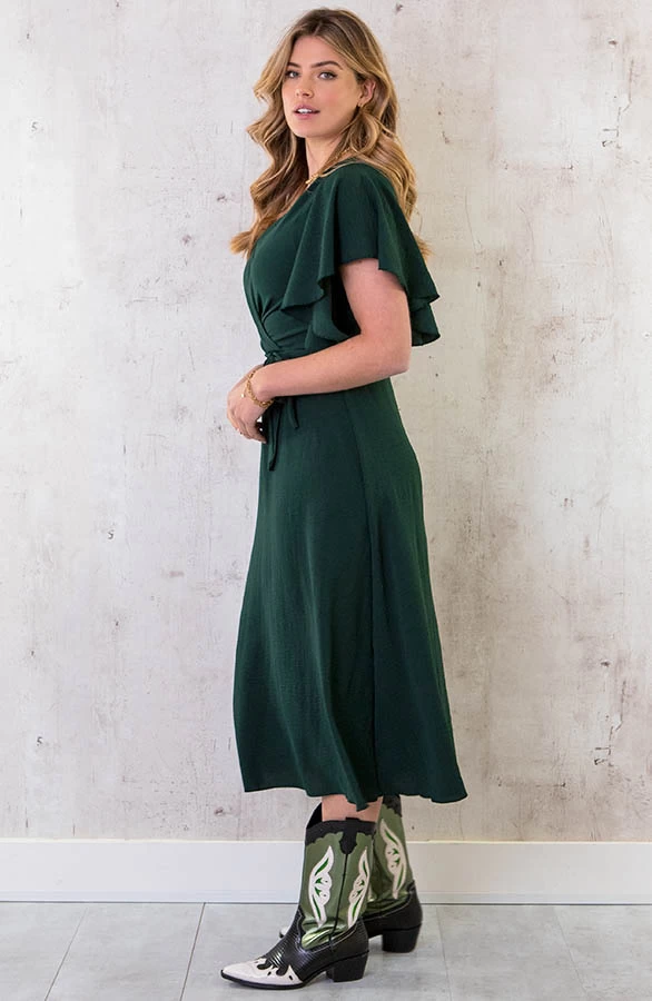 Product: Deze bestseller mag niet ontbreken in jouw garderobe! De v-hals jurk is voorzien van vleermuismouwen, elastiek in de taille en een bijpassend lint om te strikken.