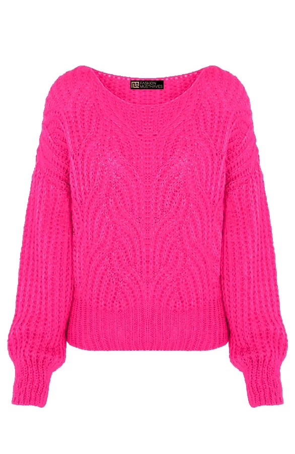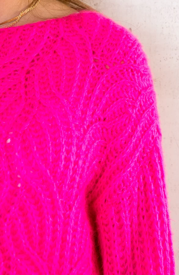 Product: OH-MY! Deze fuchsia trui mag niet ontbreken in jouw garderobe! De gebreide trui is voorzien van een boothals en zit heerlijk comfy!