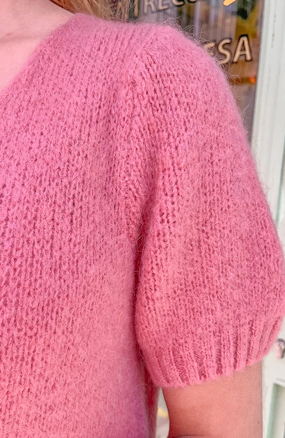 Details: elastieken band, v-hals, korte mouwen en gebreid Materialen: 10% Wol, 20% Mohair, 26% Polyamide, 44% Acryl