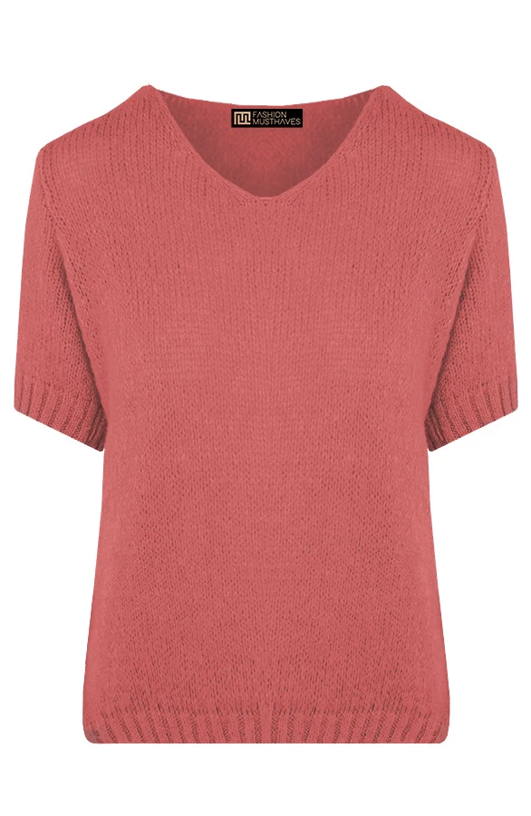 Product: Oohlala! Hoe cute is deze gebreide trui met korte mouwen?! De trui is voorzien van een v-hals en een elastieken band aan de onderkant en bij de mouwen.