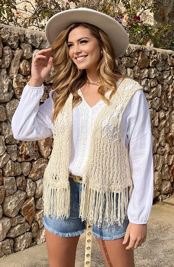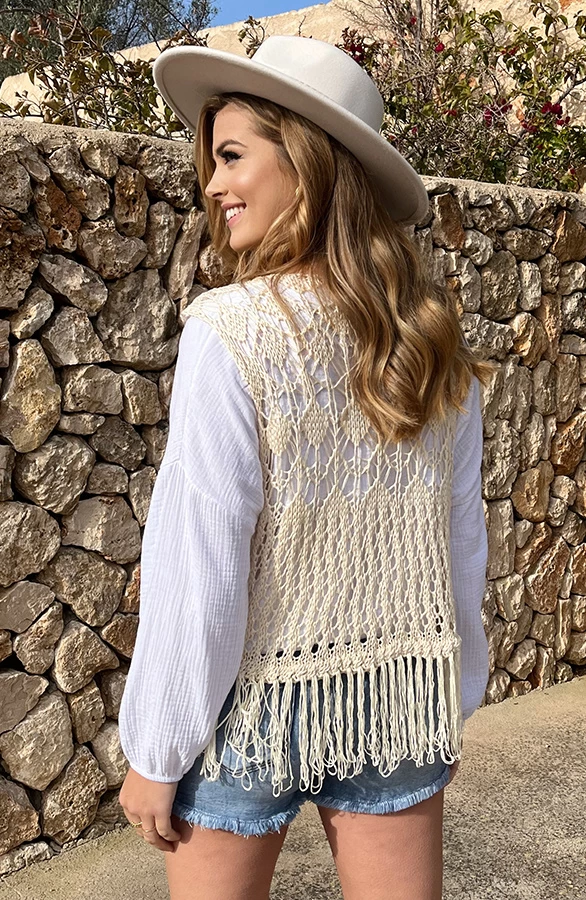 Product: Creeer de perfecte fashion look met dit beige gehaakte gilet! De gilet is voorzien van franjes en is verkrijgbaar in meerdere kleuren.