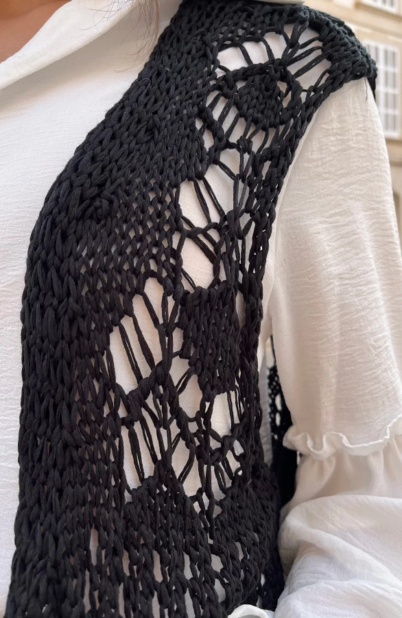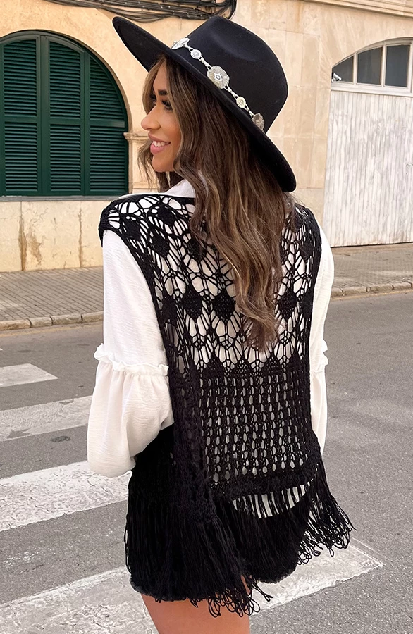 Product: Loop er helemaal on trend bij met deze super leuke gehaakte gilet! De gilet is voorzien van franjes en is enkel open te dragen.
