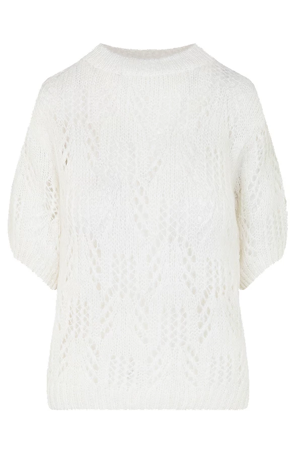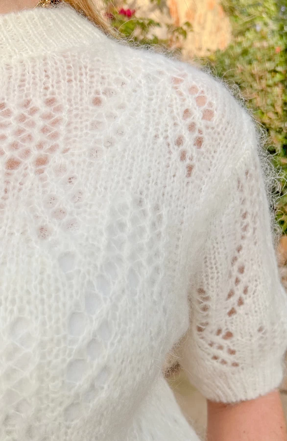 Details: ronde hals, korte mouwen en gehaakte stof Materialen: 42% Acryl, 40% Mohair, 18% Polyamide