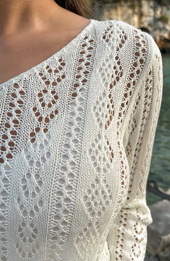 Details: v-hals, lange mouwen, doorschijnende stof en gehaakte stof Materiaal: 100% Katoen